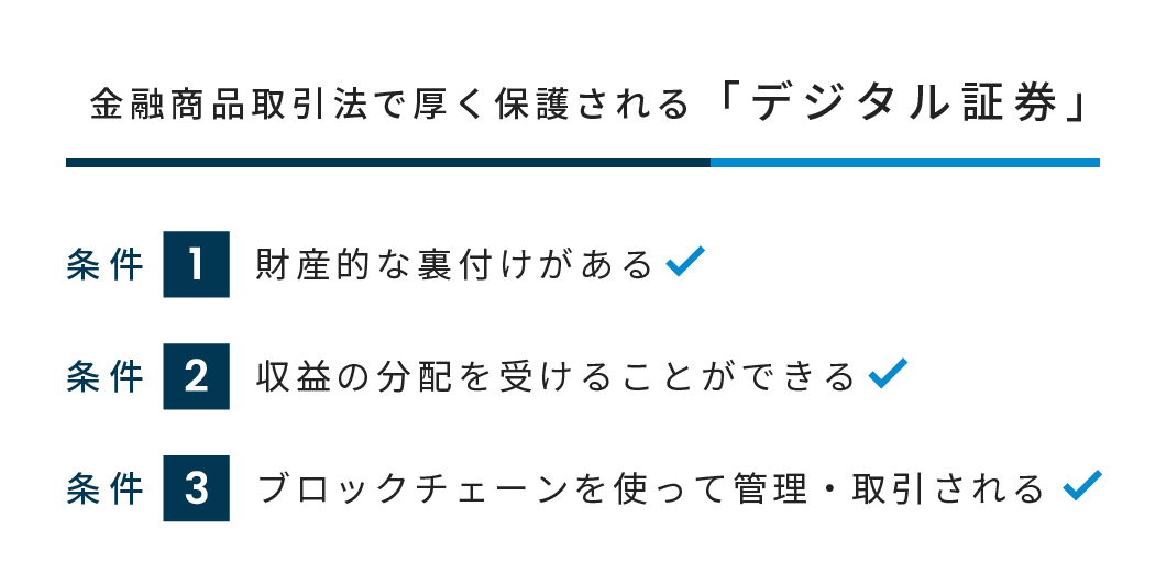 この書き方や関連する規定を合わせて、ステレオタイプにかみ砕くと、「①財産的な裏付けがあり、②収益の分配を受けることができる、③ブロックチェーンを使って管理・取引される」この3つの条件を満たしたものがデジタル証券です。